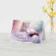 A Christmas thank you folded greeting card. Designed with a photograph of a ginger kitten sitting on a soft white and red Santa hat. Blurry glittering lights bokeh background. Personalize with a name on the front and personalize the message inside the card.
