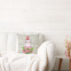 A pillow with a cute and whimisical design featuring an adorable penguin wearing a red santa hat. Standing behind a bouquet of flowers with pink and white striped candy canes. Faux wood background.