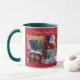 Red Merry Christmas coffee mug with changeable photos and text - you can add your family name and change photos, printed on red background