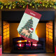 This beautiful pug has their head tilted inside of a cute Santa Claus hat. The adorable dog is sitting in front of a pretty Christmas tree decorated with colorful ornaments. Personalize this Christmas stocking for your pet in lovely red cursive above the wonderful drawing of my favorite doggy.