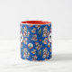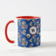 This cute mug features a cute pattern of raccoons wearing Santa hats and holding Christmas presents -- plus a snow globe and a Christmas tree with ornaments - on a bright royal blue color. The option shown has a red handle and red interior, but you can choose from many mug and other drinkware options. Your or your recipient's initial is encircled in blue and red on both sidesof this cheery woodland design. Make sure to type the initial you want in the Personalize section.