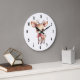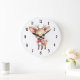 A clock with an illustration of an adorable baby deer. Big eyes big ears with a large head and little brown antlers. Wearing a big red bow.