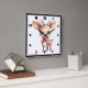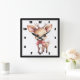A clock with an illustration of an adorable baby deer. Big eyes big ears with a large head and little brown antlers. Wearing a big red bow.