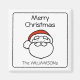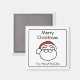 A square magnet with a cute black line drawing Christmas Santa Claus wearing a red hat and with customizable greeting above and personalized family name below, and also with a black rounded square border. You can change the greeting and the family name right on the product page. Featuring original art from Dogwood & Thistle.