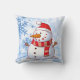 A cute Christmas snowman who is kind of chubby and jolly wearing a striped scarf and a red christmas hat. Snowflakes and bokeh style lighting make up the background.