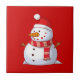 A cute Christmas snowman who is kind of chubby and jolly wearing a striped scarf and a red christmas hat. Festive and fun.