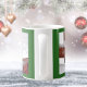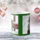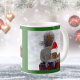 This mug features two cute photos of squirrels, against a green background, who appear to be wearing Christmas hats. One of the furry critters appears to be holding holding a candy cane. This mug is a great way to drink your Christmas cocoa or warm eggnog and toast in the holiday season. One squirrel is wearing a red Santa's hat, and the other is wearing a elf's green hat.