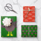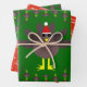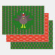 This awesome gift wrap set features a funny cartoon of a Christmas turkey with big black eyes, a small yellow beak and tail feathers sticking up. The feet are facing in opposite directions making the turkey look clumsy. The turkey is wearing a red and white Santa hat and is ready for Christmas.