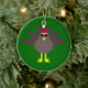 This ornament features a funny cartoon of a Christmas turkey with big black eyes, a small yellow beak and tail feathers sticking up. The feet are facing in opposite directions making the turkey look clumsy. The turkey is wearing a red and white Santa hat and is ready for Christmas.
