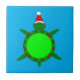 This awesome tile features a cute Christmas Sea Turtle with a green shell and 4 legs. The turtle is wearing a festive red and white hat. It has cute black and white eyes and a tiny green tail. The outer section of the shell is decorated with alternating holly leaves and berries and pretty red poinsettia flowers.