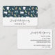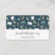 A business card with a whimsical festive pattern. Polar bears, reindeers, trees. foxes, and snowflakes. On a dark green background.