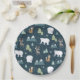 Paper plates with a whimsical festive pattern. Polar bears, reindeers, trees. foxes, and snowflakes. On a dark green background.