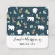 A square business card with a whimsical festive pattern. Polar bears, reindeers, trees. foxes, and snowflakes. On a dark green background.