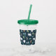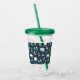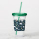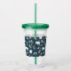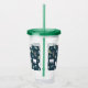 Acrylic tumbler with a whimsical festive pattern. Polar bears, reindeers, trees. foxes, and snowflakes. On a dark green background.