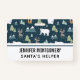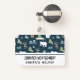 Name badge with a whimsical festive pattern. Polar bears, reindeers, trees. foxes, and snowflakes. On a dark green background.