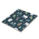 A ceramic tile with a whimsical festive pattern. Polar bears, reindeers, trees. foxes, and snowflakes. On a dark green background.