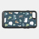 Otterbox phone case with a whimsical festive pattern. Polar bears, reindeers, trees. foxes, and snowflakes. On a dark green background.