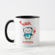 A cute, simple personalized penguin Christmas holiday mug. Penguin is wearing a red polka dot hat and a blue scarf and holding a candy cane. Personalize it for a gift or for yourself! Designed for you by Blackberry Boulevard.