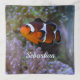 Cute and colorful orange & black clownfish swims near coral with sea anemone in the background. Focus is on the clownfish in this fun & unique original diver's underwater nature photography. Use our simple template t add personalized name or text of choice in trendy script.