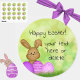 Make Easter egg-stra magical with these cute, colorful stickers featuring a sweet smiling cartoon bunny and purple Easter eggs on a grassy green background. Perfect for holiday gifting, cards or crafts, the sticker text reads "Happy Easter!" with additional space for your own message (or leave blank). A fun, whimsical addition to your Easter celebrations. Great for kids or adults alike!