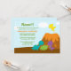 This boy's birthday party invite has a cute colorful dinosaur design. There is a volcano on the bottom right with three dinosaurs standing in front of it, with a yellow one flying. You can easily customize your party information on the left. Graphics by Stockberry Studio at Mygrafico