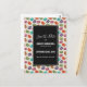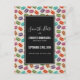 A save the date party postcard with a cute pattern of macarons in many different colors with a faint polka dot pattern behind. A black rectangle layered over top with your text inside.