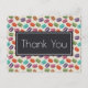A thank you postcard with a cute pattern of macarons in many different colors with a faint polka dot pattern behind. Layered over top is a black rectangle with the words: Thank You written inside. Personalized message on the back.