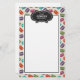 Stationery paper with a cute pattern of macarons in many different colors with a faint polka dot pattern behind. A white rectangle layered over top to write inside. At the top is a fancy vintage-looking black and white decorative frame with your personalized text inside.