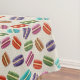 A tablecloth with a cute pattern of macarons in many different colors with a faint polka dot pattern behind.
