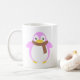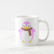 A blue Penguin with a green scarf, a Pink Penguin with a brown scarf, and orange penguin with a blue scarf, and a green penguin with a red scarf. Collect them all, or look for the design with all four penguins in a little row. So cute!