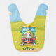 This personalized baby bib features a cute colorful train on a rail track with beautiful surroundings