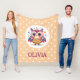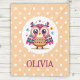 Personalized cute, colorful, whimsical owl design with polka dots on a yellow background.