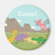 A cute and colourful dinosaur magnet which kids can use to attach their dinosaur drawings to the fridge. It comes with cartoon dinosaurs, a yellow Brachiosaurus, a purple Triceratops, a green Stegosaurus and a pink Pterodactylus. Background of mountains and clouds. This attractive design is great for kids who love Jurassic, prehistoric or dinosaur themes. Personalise with child's name to make it extra special!