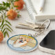 This keychain features a portrait of a beautiful gold and white Corgi dog. The image is placed on a retro, slightly distressed tan, gold, and blue retro style striped background. The back has a solid blue background with your text in two fields.