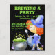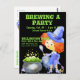 A cute, red-headed witch, dressed in purple from her tippy hat to her kicky boot slippers (except for her striped socks) holds a spoon above a cauldron boiling with green bubbles. Her black cat looks on in approval. At her feet and the feet of the round, metallic pot are colorful mushrooms. All illustrations are in watercolor. The background is black. An interesting "Eyeballs" font has been selected for the most prominent lines of type, all in a bright green to match the witch's brew. For RSVP, we have used "Regrets Only". However, if you want a different RSVP, there is room for an extra line or two. The back is typical postcard, with your return address and personal message in the same fonts as the invitation on front -- only green against white. Also on the back, our adorable witch is riding her broom above the "Kindly Deliver To:"