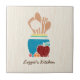 Add a touch of hominess to your kitchen with this cute country style tile featuring a hand drawn style set of wooden spoons and kitchen utensils in a turquoise pot surrounded by a delicious red apple and fresh fruit. This country kitchen themed design on a light wood pattern background can be personalized by adding your name.
