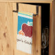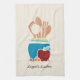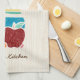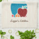 Add a touch of hominess to your kitchen with this cute country style kitchen towel featuring a hand drawn style set of wooden spoons and kitchen utensils in a turquoise pot surrounded by a delicious red apple and fresh fruit. This country kitchen themed design on a light wood pattern background can be personalized by adding your name.