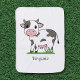 A baby blanket with a cute cartoon style cow and a cute cow face on the back. The baby's name could be changed for a perfect personalized gift for new parents!