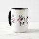There are four cute white cows looking out at you on this mug. They have pink noses, udders and ears and are otherwise white with black spots. This mug has a black rim around the top and a black handle but you can change these color accents to pink if you prefer. You might think this design looks better on another style of mug and you can easily customize your choice.