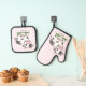 A pink Oven Mitt & Pot Holder Set with a cute cow on grass and customizable text below. Perfect to make a gift to a farmer, best friend or for newlyweds!