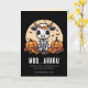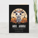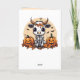 Picture a super adorable greeting card with a little skeleton cow front and center. This cow isn't spooky at all—instead, it's like a cute Halloween costume party guest! It's got a bony body, but it's dressed up in a cow costume, complete with black-and-white spots on its skeletal frame. Its eye sockets are like two friendly dark spots, and it's got the sweetest grin on its face as it holds a mini pumpkin bucket in one bony hoof. The background is all festive, with colorful leaves and pumpkins, making it a spooky-cute scene that brings a big smile to your face!