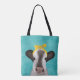 Add a name to create a personalized gift that's perfect for anyone who loves cows. This cute tote bag features my painted illustration of a cow wearing a yellow bow. The graphic is set against a turquoise blue background. Your name or other text appears in bold white letters on the front of the bag.