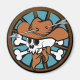 Cute cowboy skull and crossbones with arrow through his hat is set in front of a wagon wheel.