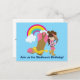 Cute cowgirl birthday postcard invitation featuring a little girl dressed in pink leaning against a cowboy boot and tipping her hat. The rainbow against the blue sky background makes a pretty touch for this cool custom rodeo party invite.