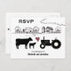This wedding RSVP card features a silhouette cow, calf and tractor. They are set against a charming line drawing country farm.