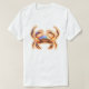 A vibrant, almost iridescent crab is centered against a plain sand colored background, with its claws raised and ready. The creature's shell and limbs glow with a spectrum of fiery colors, imparting a sense of life and motion.