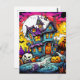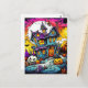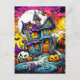 This artistic and colorful postcard features a haunted house in the moonlight.