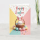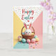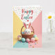 This card shows a white bunny with closed eyes and rosy cheeks, its long ears lined in pink as it peeks from a woven straw basket with a sweet, shy kind of closeness 🐰. Around the basket, pastel eggs in soft blue, gentle pink, and sunny yellow spill outward, some with neat white stripes that make the scene feel lively without being loud. Smaller candy-like pieces in matching colors sit between the eggs, like little treats shared between friends. The background is divided into wide sections of pale yellow, blush pink, and calm aqua, giving the bunny and basket a cozy place to stand. Near the top, a white triangular area is sprinkled with tiny multicolored dots, like confetti drifting down. Across this upper area, “Happy Easter” appears in warm red and soft teal lettering, with a small heart tucked nearby 🌷. The basket’s woven texture is shown with light tan lines, and a few eggs overlap its rim to create depth. The bunny’s ears rise above the basket against the dotted white triangle, with the red-and-teal text centered above them.