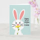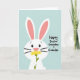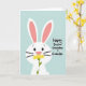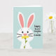 Designed with a minimalist touch, this illustration features a long-eared white bunny 🐰 positioned toward the left and lower center against a muted robin’s egg blue background with a faint grid-like texture. Its tall ears show soft pink inner details, and its simple black dot eyes with gently arched brows give it a tender, attentive look, as if watching someone it cares about. Near its nose, the bunny holds a bright yellow flower on a slim green stem, suggesting a shy little offering between friends or sweethearts 🌷. The open space around the figure keeps the scene airy, letting the small gesture feel more intimate and noticeable. Soft pastel tones—white, pink, blue, and the pop of yellow—create a calm springtime setting without clutter. On the right side, a short greeting appears in small black lettering, placed mid-to-upper area so it balances the bunny on the left. The yellow petals sit closest to the bunny’s nose, with the green stem angled slightly upward from its paw.