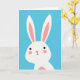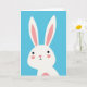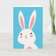 This card features a stylized white bunny shown from the chest up, filling most of the frame with tall ears reaching toward the top edge 🐰. The ear interiors are a soft pink, and the face is kept simple with round black eyes, a tiny inverted V-shaped nose, and rosy pink cheeks that read like a shy, affectionate blush. A smooth, solid sky-blue background surrounds the figure, making the white and pink shapes stand out clearly and giving the scene an open, airy feel 🌷. The close crop makes it feel like the bunny is leaning in for a friendly hello, as if sharing a quiet, sweet moment with the viewer. A small pink oval on the lower body hints at a gentle belly and adds balance to the design. There’s no printed message or lettering on the front, leaving open space around the ears and across the blue field for text placement if desired. The blue backdrop stays uniform all the way to the edges, with the bunny’s ears and rounded cheeks as the main visual accents.